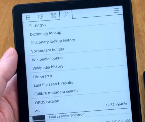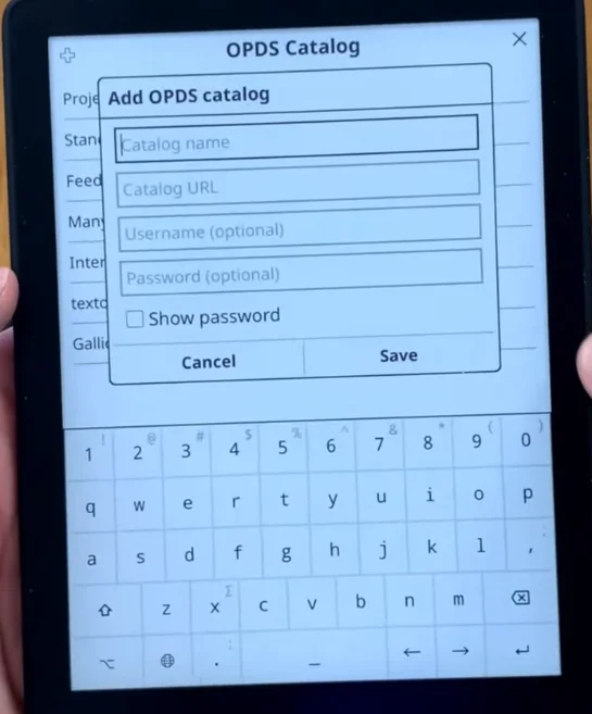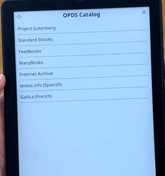 Una vez más, el bueno de Stefan Svartling tiene un video explicando a detalle esto. En el menú de la lupa, en la parte de OPDS, se configura la dirección del servidor de Calibre. Al darle en el más (que podría estar en un mejor lugar y no en la esquina), abrirá un menú para agregar tu servidor; también hay otras rutas que puedes usar.