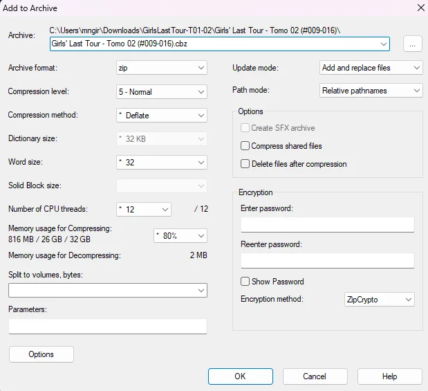 De ejemplo usaremos el tomo 1 de Girls Last Tour, descargado de Tomos Manga SOLO COMO EJEMPLO. Descomprimimos el archivo CBR y en la carpeta estarán todas las imágenes; seleccionamos todas las imágenes y en la opción de 7z seleccionamos Add Archive y en la ventana que abre solo cambiamos la extensión del archivo a .cbz y ese archivo ya lo podemos agregar a Calibre y mandarlo a la Kindle.