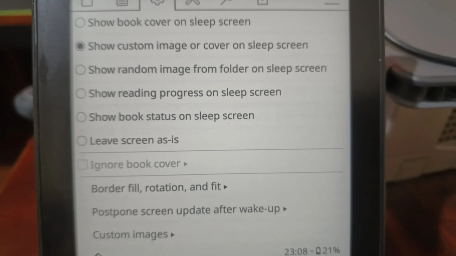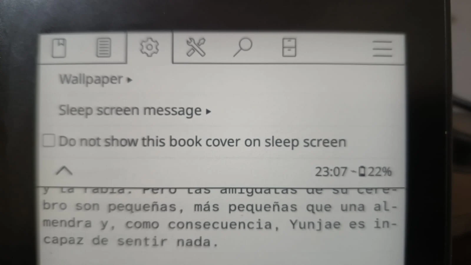 Bueno, ahora vamos a lo ESTÉTICO, a lo que de verdad importa, un cover para cuando nuestra Kindle esté en reposo. Nos vamos al menú de la tuerca y vamos a Screen/Sleep screen. En la opción de Sleep screen message, yo la desactivé, pero puedes poner un mensaje motivacional para no matarte en lo que terminamos de configurar esto (vamos por la mitad) y en Wallpaper, seleccionar la opción de custom image or cover y luego le damos en Custom images para seleccionar la imagen. Todas las imágenes estarán en la ruta /mnt/us/koreader/data/screensaver.