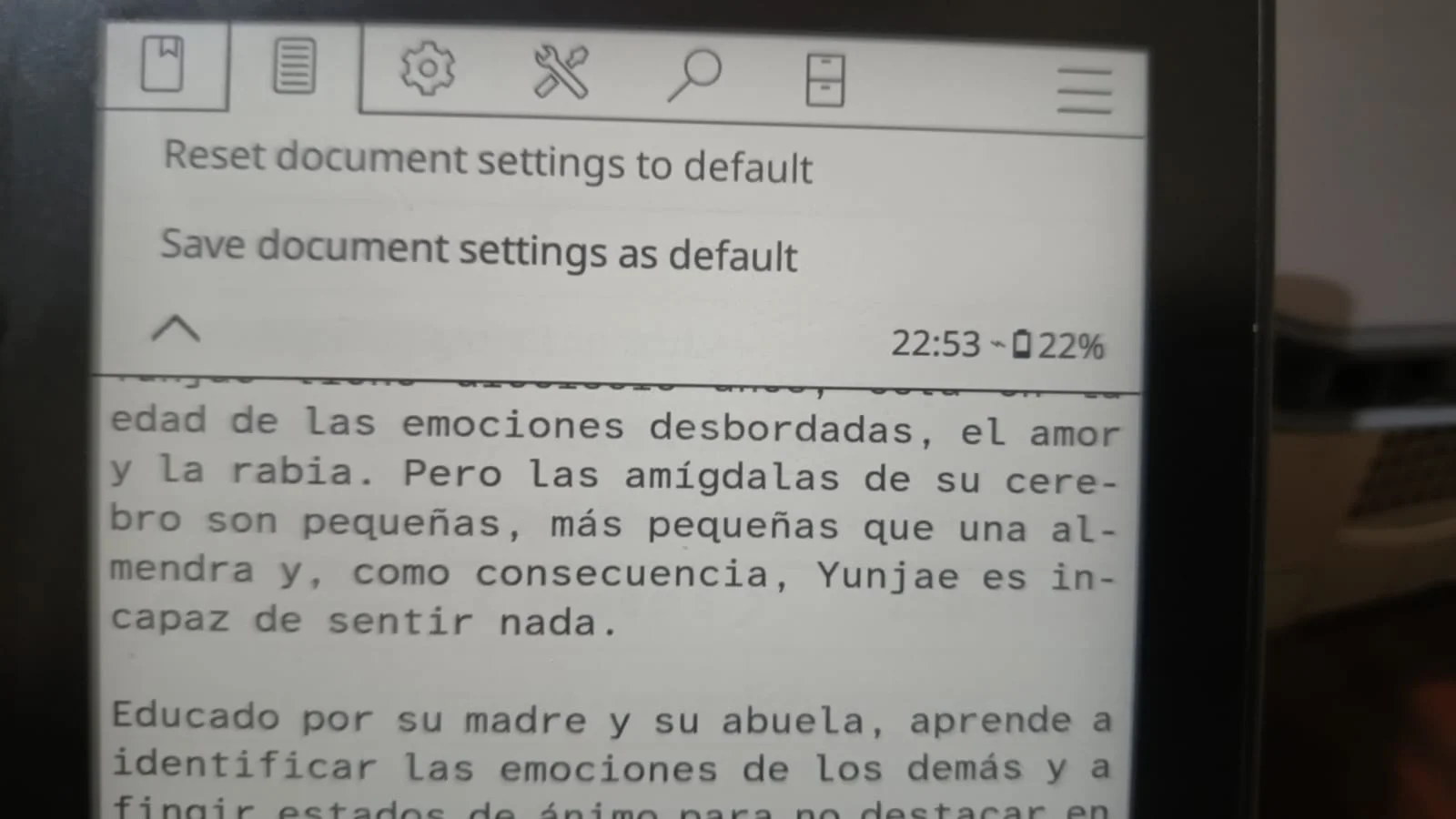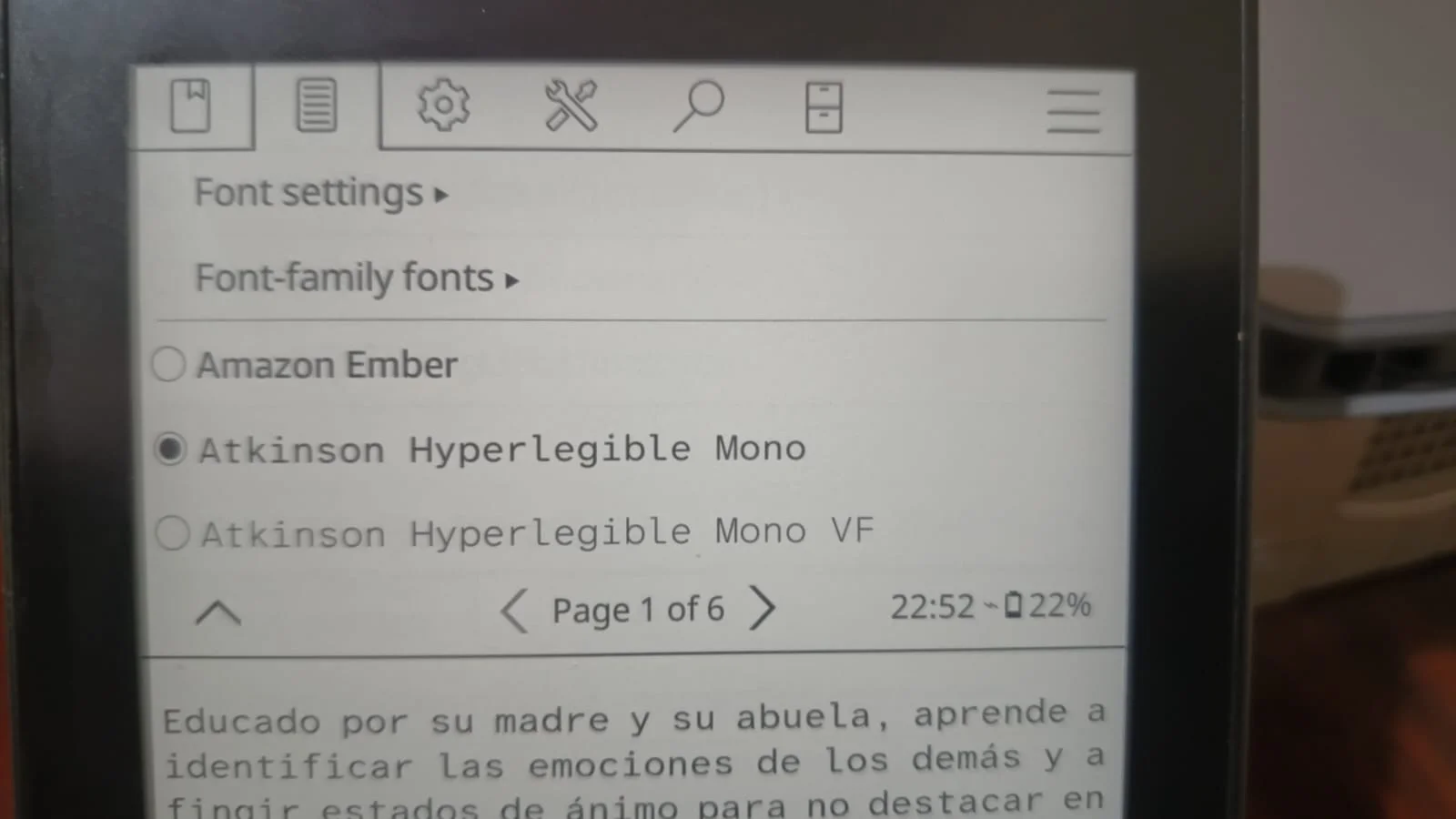 Ya que estamos en un libro, vamos a cambiar la fuente y hacer que sea la predeterminada para todos los libros. Es sencillo: en la carpeta de koreader, busca la carpeta Font y allí metes la que tú quieras; yo usé la Atkinson Hyperlegible.