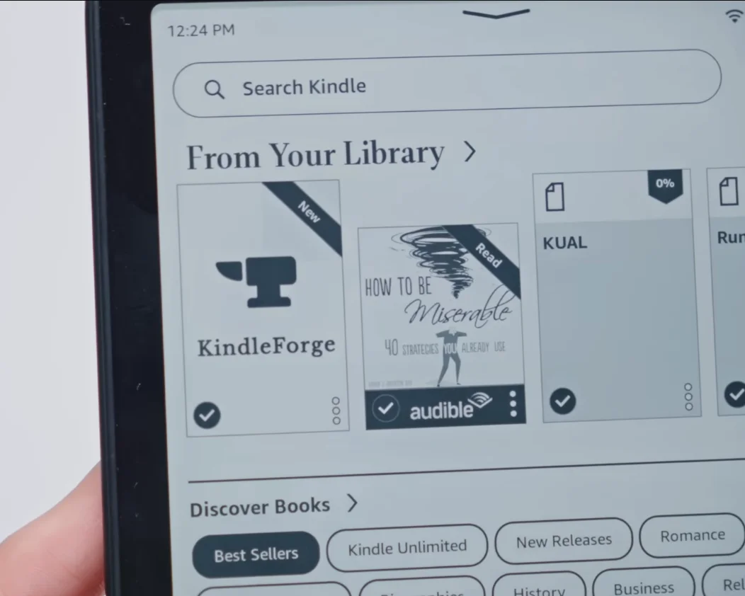 Luego de liberarla, podías tener KindleForge que es el appstore; solo tienes que instalar lo que quieras y la única que se necesita es Koreader. Esto hace que cambie la interfaz de tu biblioteca y la puedas organizar de otra manera, y aquí empieza un poco mi travesía con esto, porque si vas a meterle mano a un aparato, lo mínimo que debes hacer es personalizarlo a tu gusto, aunque eso te lleve al borde de la locura.
