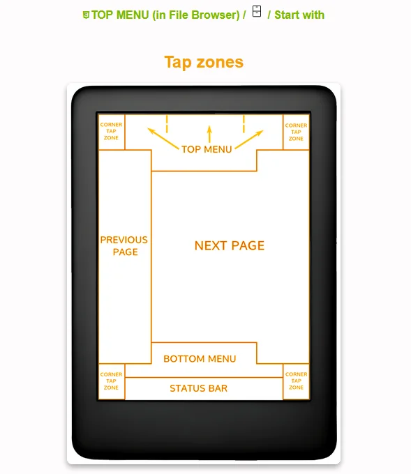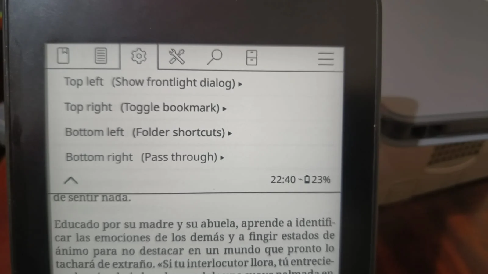 Una vez hechos los shortcuts, haremos que podamos acceder a ellos desde dentro de un libro para no tener que entrar en otro menú. Esto lo haremos con los gestos; KoReader tiene un mapa de la pantalla en donde hay espacios libres donde podemos colocar acciones presionando esas áreas.