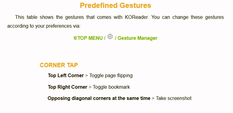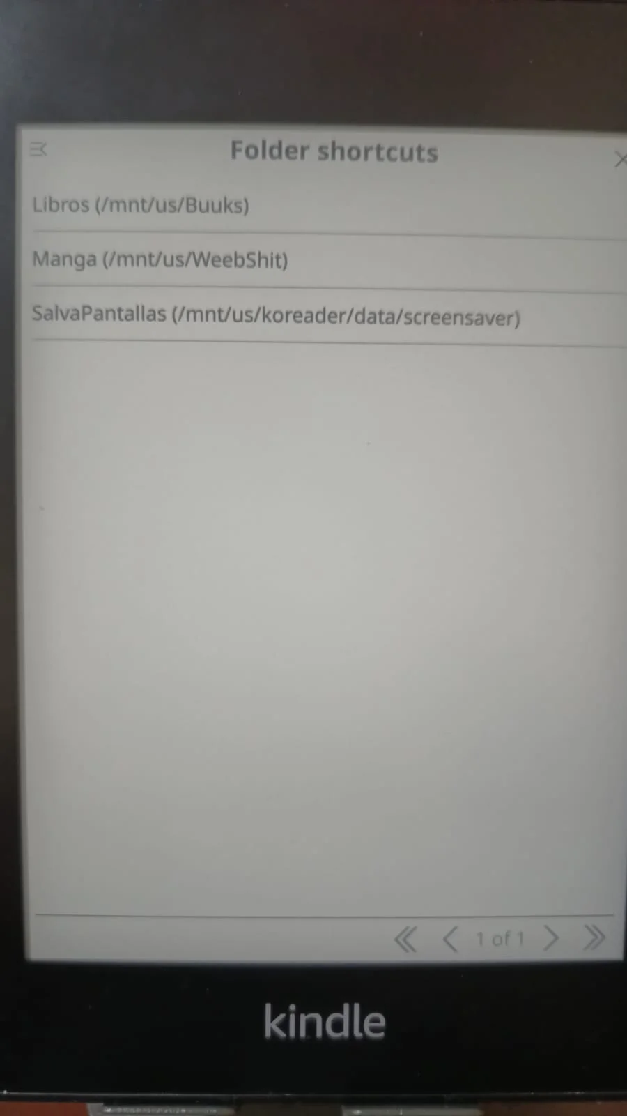 Muchas de las cosas, si no es que la mayoría, están explicadas a detalle en la documentación y la guía de uso de KOReader; yo solo menciono las que usé mientras configuraba mi Kindle. Los accesos directos que usé fueron para la esquina inferior izquierda, los shortcuts, y para la esquina superior isquierda para cambiar el brillo de la pantalla.