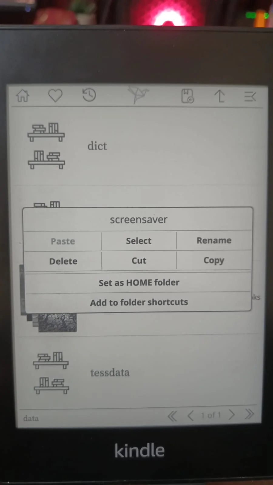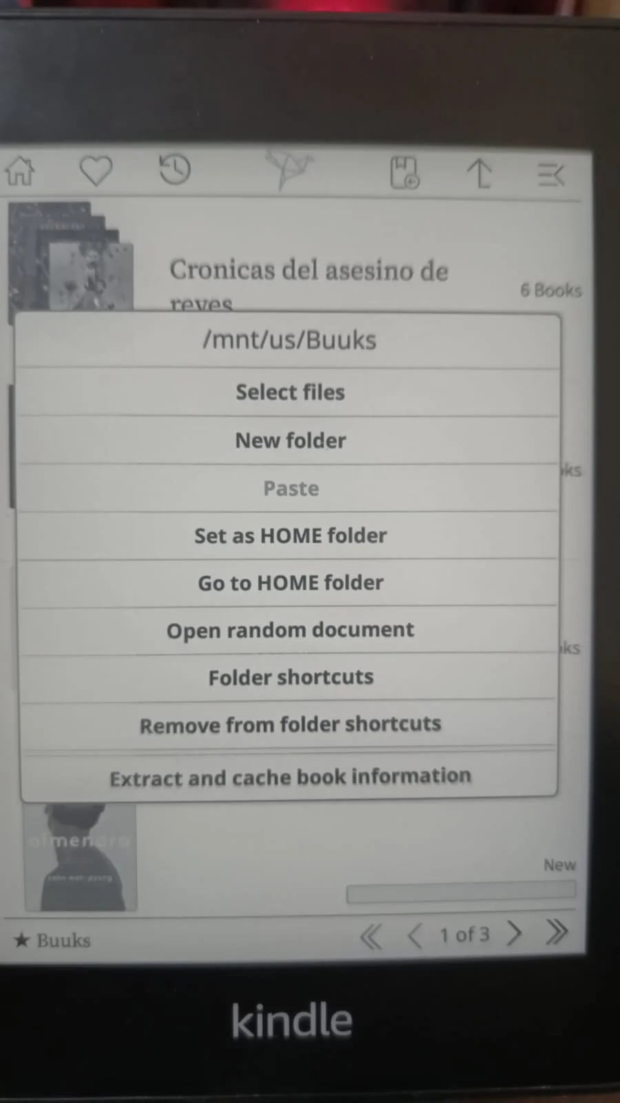 Lo primero será usar los shortcuts para poder moverse por la librería lo más fácil posible. Yo tengo 2 carpetas principales en donde están los libros y otra con mis mangas; con esto se me hace más fácil cambiar entre cada una. Es bastante sencillo: en tu página principal hay un icono en forma de flecha hacia arriba; con esto vas, te mueves entre las carpetas de tu Kindle. Cuando estés en la carpeta que quieres hacer un shortcut, presiónala y aparecerá un menú en donde te dirá si deseas agregar esta carpeta al folder de shortcuts y podrás ponerle un nombre. En este ejemplo lo haré con la carpeta en donde guardo las imágenes de salvapantalla de la Kindle.